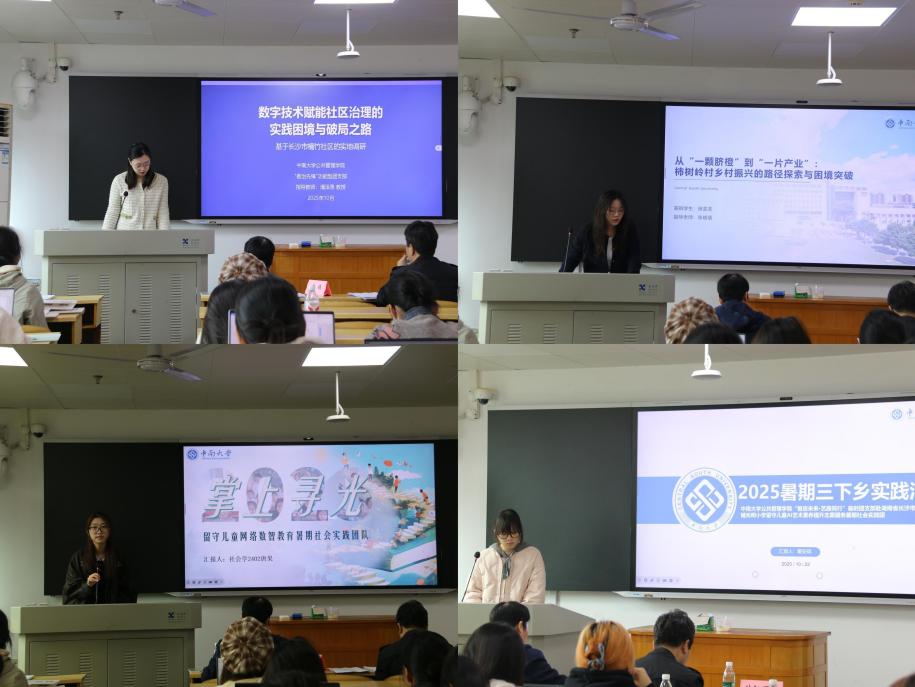 为深入推进实践育人,总结2025年暑期“三下乡”社会实践,10月22日下午2时我们于世纪楼主楼304举办2025年暑期“三下乡”社会实践总结答辩暨经验交流会。此次活动邀请行管系主任欧阳万福老师、社会学系黄娟老师担任专家评审,我们分团委科实部熊妍担任主持人。