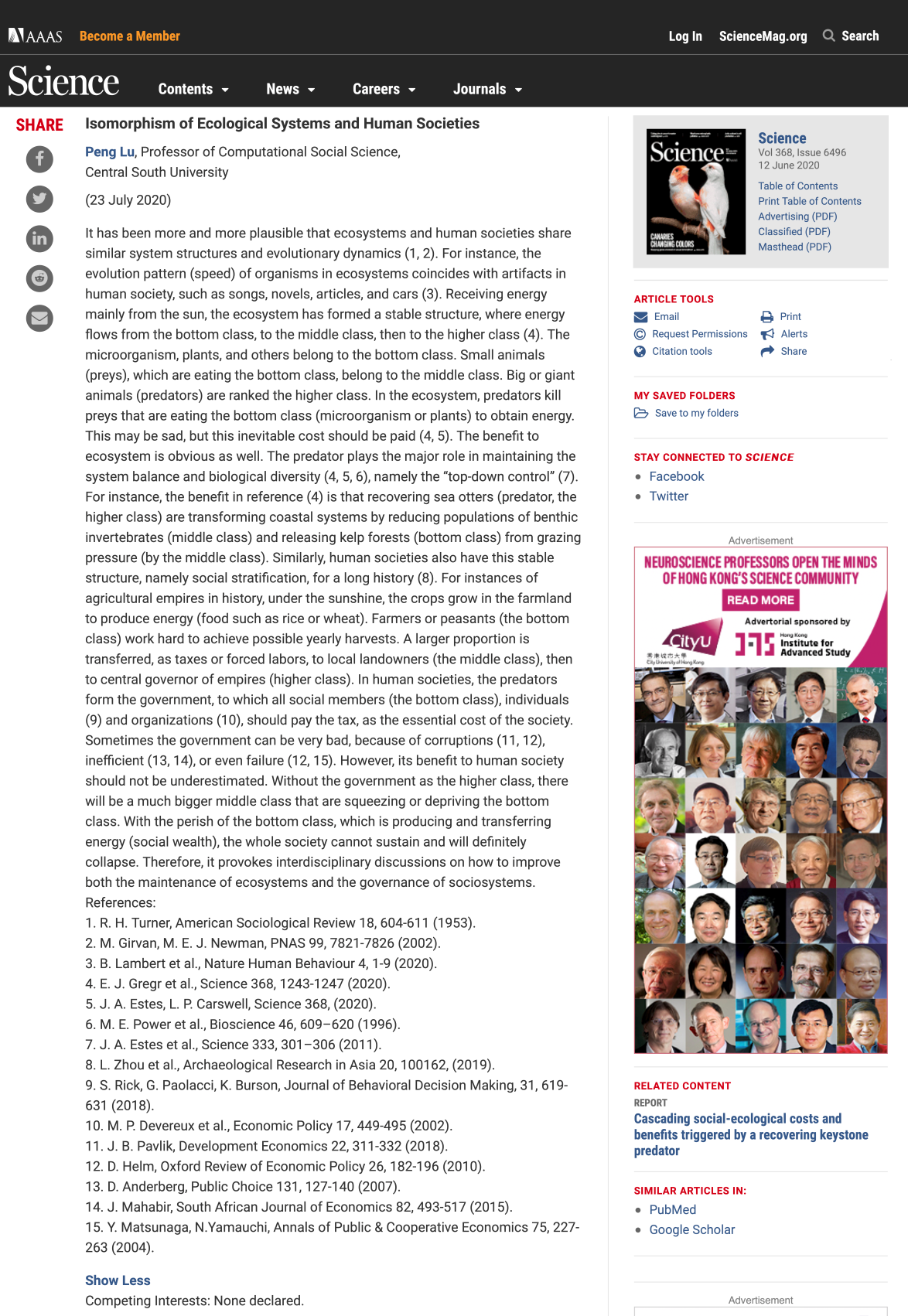 我们社会学系吕鹏教授近期在《Science》杂志在线发表eLetter文章《Isomorphism of Ecological Systems and Human Societies》,针对Science两篇近期文章进行点评,阐述生态系统演化与社会系统治理观点。第一篇是Gregr等人的研究论文《Cascading social-ecological costs and benefits triggered by a recovering keystone predator》。发现大西洋沿岸某生态系统中,由于海獭(sea otters)增加,导致被捕食者benthic invertebrates数量被控制,从而促进了kelp forests等底端生物的生长。整个生态系统由于海獭的存在,变得更加优化与多样性,以较大幅度37%增加了生物数量(biomass)。取得了正面的总体系统性经济收益。第二篇是Estes & Carswell的评议文章《Costs and benefits of living with predators》,从生态学-经济学等进行点评,就具体测算、模型问题等进行讨论与评议。吕鹏教授从社会生态系统与社会仿生学角度阐述观点,认为人类社会有机体系统也存在类似拓扑结构即社会阶层结构。如果存在一个治理有方的强有力政府,将会在很大程度上优化社会治理,提升全社会福祉,促进最大公约数的提升(此次疫情中已经得到体现)。相关观点为社会系统论、计算社会学、社会物理学、社会仿生学、历史社会学等研究奠定数学理论与拓扑模型基础,为“放水养鱼”、新业态培育、简政放权、做强小微企业、激发市场活力等公共政策提供系统性参照与导向。